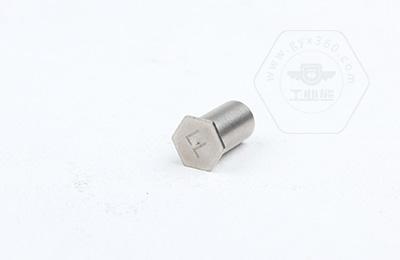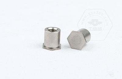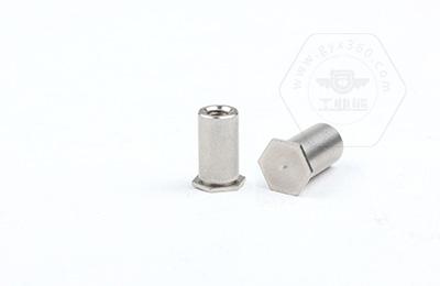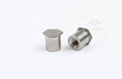 通過壓力機將六角頭壓入薄板的預置孔內(預置孔的孔徑一般略大于壓鉚螺柱的圓柱外徑)使孔的周邊產生塑性變形,變形部分被擠入壓鉚螺母柱的退刀槽內,使壓鉚螺母柱鉚緊于薄板上,從而在薄板上形成一下有效固定的內螺紋。